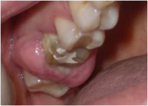 Clinical case 5. A female patient V., 47 years old, referred to the clinic with complaints of a neoplasm in the region of the crown of 1.6 tooth. Anamnesis: the patient detected the neoplasm about 3 months before, noted its slow growth. On examination of the oral cavity a neoplasm was found on the maxilla between the crowns of 1.6 and 1.7 teeth on the vestibular and palatal side on a wide base, of dense-elastic consistence, painless and mobile to palpation (Fig. 16). Clinical diagnosis: fibromatous epulis of the maxilla in the region of 1.6 and 1.7 teeth.