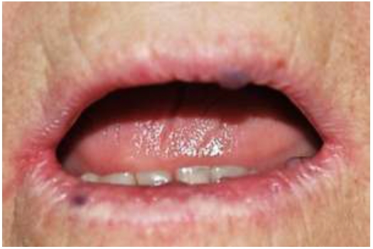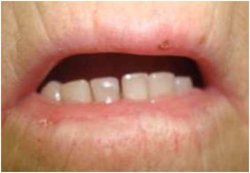Clinical case 6. A female patient, 74 years old, referred to the outpatient clinic with complaints of formations of cyanotic color on the upper and lower lip. Anamnesis: the patient noticed the formations 10 years before as painless spots of blue color. They grew slowly without making any discomfort. Recently they began to increase. On examination spots of cyanotic color and round shape were detected on the right side of the red border of the lower lip and on the left side of the upper lip, 0.3 cm and 0.5 cm in diameter, respectively (Fig. 20). Formations were immobile, painless to palpation, with positive filling syndrome. The diagnosis: cavernous hemangio-mas on the right side of the lower lip and on the left side of the upper lip. Ablation was conducted with the diode laser under infiltration anesthesia (Figs. 21, 22). Immediately after laser treatment the formations significantly diminished and grew paler. Postoperative period was without complications. In 10 days regression of vascular structures was observed (Fig. 23).