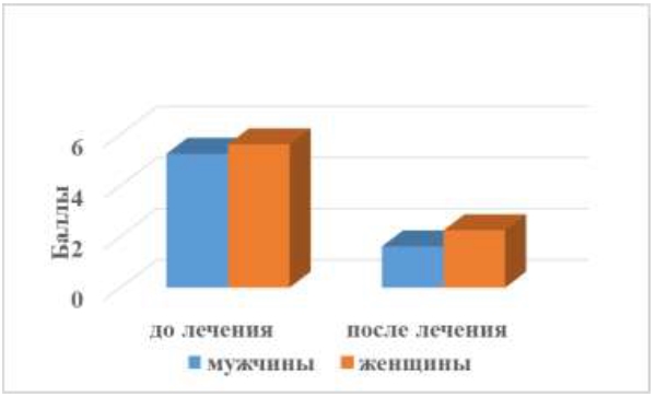 Results of examination conducted before rehabilitation showed no reliable differences in the intensity of the pain syndrome evaluated by VAS: it was 5.25±1.64 points in men and 5.62±1.98 points in women, р>0.05 (Fig. 1).