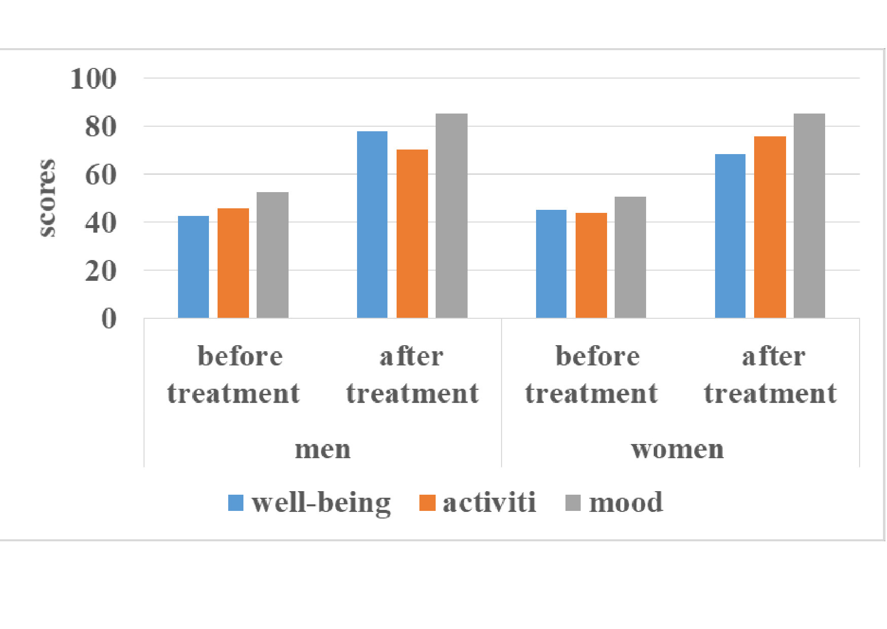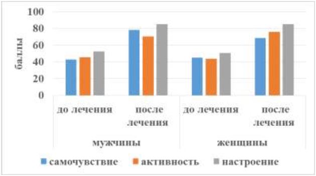 Analysis of SAN test (Fig. 2) shows a positive influence of the conducted course of treatment evidenced by the improvement of psychoemotional condition of all patients. Here, improvement of psychoemotional background in women does not depend on the extent of improvement of motor activity, but is probably associated with reduction in the extent of specific «women’s» complaints (headaches, anxiety, easy crying, etc.).