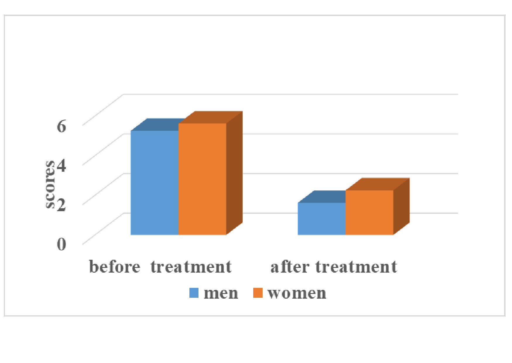 After completion of the treatment course VAS parameters showed statistically significant reduction in both groups: in men – to 1.62±0.83 points (р<0.05), in women – to 2.25±1.07 points (р<0.05), with this, there was no statistically significant difference in the quantitative evaluation of pain syndrome between the groups after the rehabilitation course. Thus, the percentage of change in the evaluation of pain syndrome was higher in men (70%) as compared to women (60%).