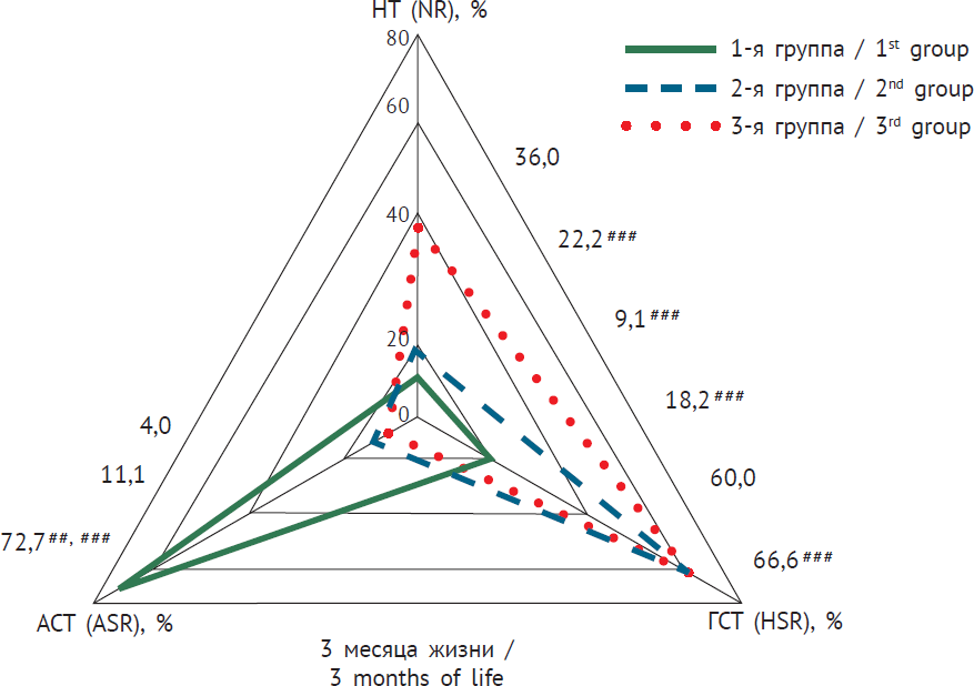 Рис. 1. Вегетативная реактивность у детей трех групп в возрасте 5 дней жизни (%). Статистическая значимость различий (р < 0,05) основной группы в пределах данного типа вегетативной реактивности с показателями: ## группы сравнения; ### группы контроля. НТ — нормальная реактивность, ГСТ — гиперсимпатикотоническая реактивность, АСТ — асимпатикотоническая реактивность