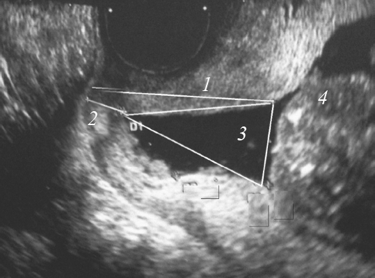 Рис. 1. Беременность 20 недель, истмико-цервикальная недостаточность: 1 — общая длина шейки матки; 2 — сохраненная часть шейки матки; 3 — воронкообразное открытие внутреннего зева; 4 — предлежащая часть плода