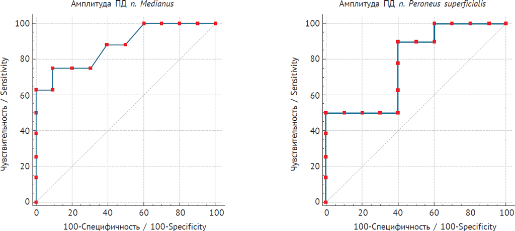 Со стороны сенсорных волокон высокой специфичностью и чувствительностью обладали параметры амплитуды ПД срединного и поверхностного малоберцового нервов (рис. 1).