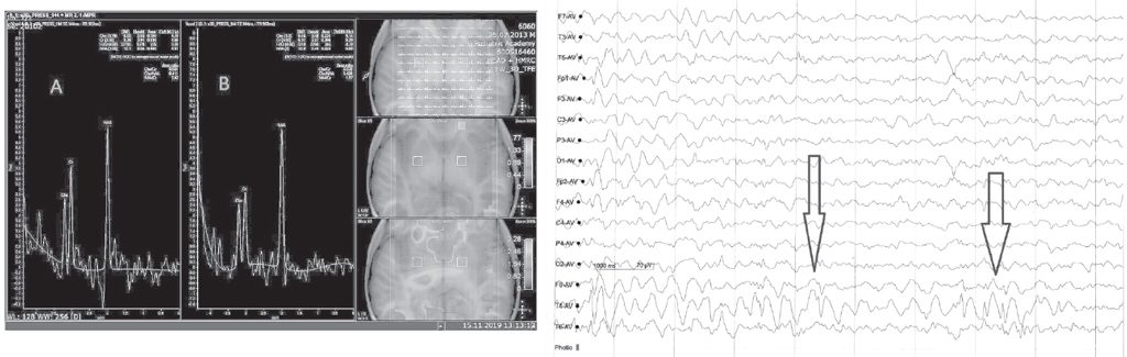 Fig. 1. Left: 1H-MRC of the brain of a patient with mental and speech development delay associated with focal temporal lobe epilepsy. Field of study: poles of the temporal lobes. There is a lateralization of pathology in the right temporal lobe in the form of a decrease in the concentration of N-acetylaspartate (A). The indicators of metabolites in the left temporal lobe are within normal values (B). Right: this patient’s EEG revealed epileptiform activity in the temporal region on the right (arrows), without generalization