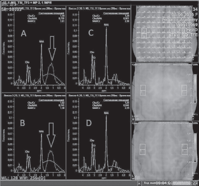 Fig. 2. 1H-MRC of the brain of a patient with mental and speech development delay associated with focal temporal lobe epilepsy. Research area: central and postcentral gyri on both sides. There is a lateralization of pathology in the right frontal and parietal lobes with a decrease in the concentration of N-acetylaspartate (A, B). Lipid peaks are visualized (arrows). In the left parts of the brain, these changes are not observed (C, D). There is also an increase in the concentration of choline on both sides