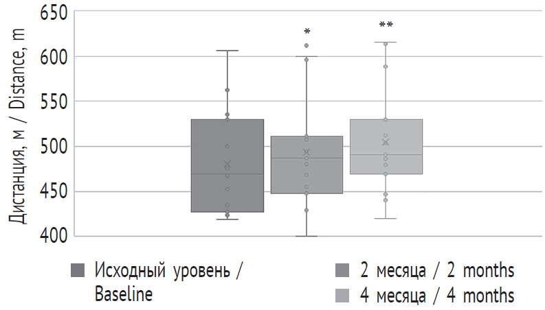 Fig. 1. Dynamic of the 6 minute walking test. * p < 0.05, ** p < 0.005 / Рис. 1. Динамика дистанции 6-минутного теста ходьбы. * p < 0,05; ** p < 0,005
