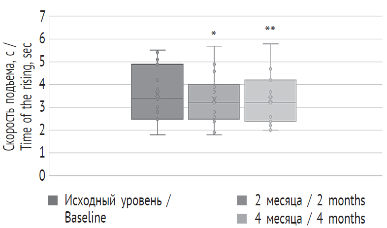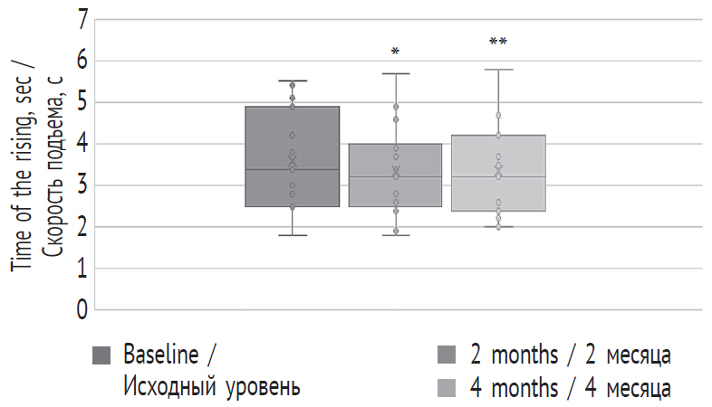 Fig. 2. The dynamics of the change in the time of the rising from the floor. * p < 0.05, ** p < 0.005 / Рис. 2. Динамика изменения скорости подъема с пола. * p < 0,05; ** p < 0,005