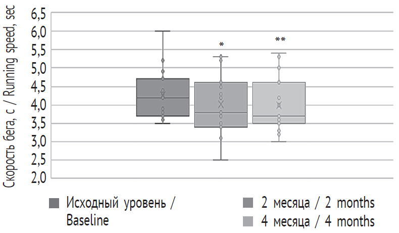 Fig. 3. Dynamics in the time of the running 10 meters distance. * p < 0.05, ** p < 0.005 / Рис. 3. Динамика изменения скорости бега на дистанцию 10 м. * p < 0,05; ** p < 0,005
