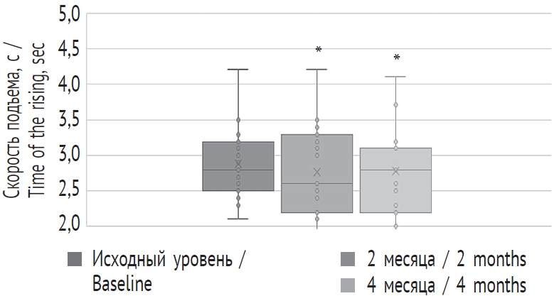 The mean values of the functional test of rising from floor were 4.4 ± 0.2 points at the initial level, 4.8 ± 0.1 points after 2 months, and 4.8 ± 0.1 points after 4 months.