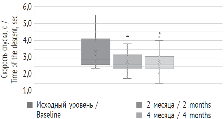 Fig. 5. Dynamics of the time of the 4 steps descend. * p < 0.05 / Рис. 5. Динамика изменения скорости спуска на 4 ступени. * p < 0,05