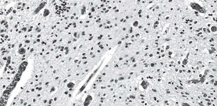 При патологоанатомическом исследовании головного мозга выявлено отсутствие деления на серое и белое вещество, студенистая его консистенция, выраженный отек и полнокровие сосудов мягкой мозговой оболочки. Правый и левый боковые желудочки, расширенные до 2,0 см, содержали умеренное количество светло-желтой жидкости со свертками крови размерами до 3,0 × 1,5 см, плотно прилегающими к веществу головного мозга.