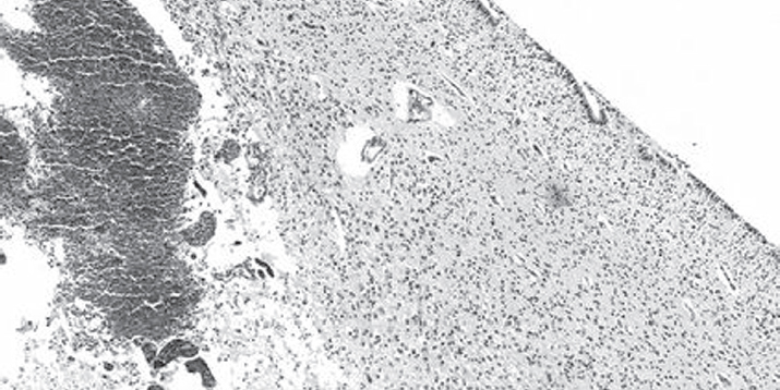 Рис. 3. Нарушение целостности эпендимы, с кровоизлиянием и выходом в полость желудочков. Окраска гематоксилином и эозином. Ув. ×10 / Fig. 3. An ependymal lesion with an intraventricular hemorrhage (H&E stain). Magnification ×10