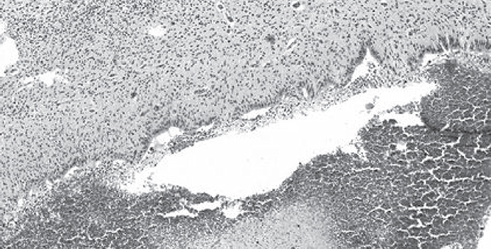 Микроскопическое исследование вентрикулярной и перивентрикулярной области головного мозга показало нарушение целостности эпендимы, в норме образующей достаточно тонкий ровный слой кубических клеток. Так, в исследуемой области эпендима представляла собой неоднородный слой клеток, местами наслаивающихся друг на друга. В отдельных участках отмечена десквамация эпендимоцитов в просвет желудочков. В проекции герминативного матрикса обнаружена густая сеть кровеносных сосудов микроциркуляторного русла (рис. 1).
