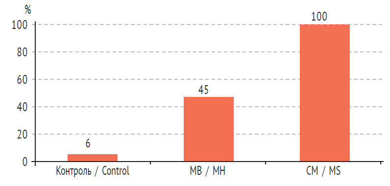 Далее была оценена доля пациентов с повышенным уровнем хотя бы одной из изоформ TGF-β у лиц с МВ и СМ (рис. 1).