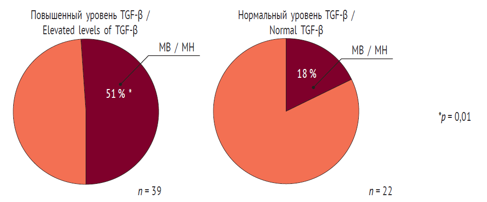 В группе лиц с превышением пороговых значений по крайней мере одной из фракций TGF-β пациенты с признаками МВ встречались почти в три раза чаще, нежели в группе с нормальными значениями TGF-β (р = 0,01, χ2 = 5,58).