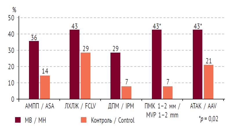 Рис. 3. Распространенность малых аномалий сердца у лиц молодого возраста с марфаноидной внешностью (МВ) и повышением TGF-β (трансформирующий фактор роста β): АМПП — аневризма межпредсердной перегородки, АТАК — асимметрия трехстворчатого аортального клапана, ДПМ — добавочные папиллярные мышцы, ЛХЛЖ — ложные хорды левого желудочка, МВ — марфаноидная внешность, ПМК — пролапс митрального клапана. * p = 0,02