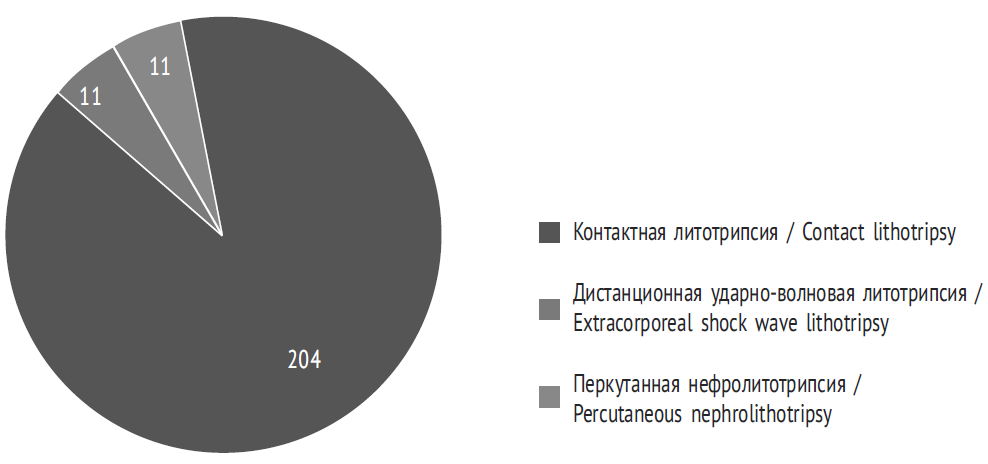 Наиболее часто выполняли такие хирургические вмешательства, как перкутанную нефролитотрипсию, дистанционную ударно-волновую литотрипсию и КУЛТ. Распределение пациентов в зависимости от вида хирургического вмешательства представлено на рис. 1.