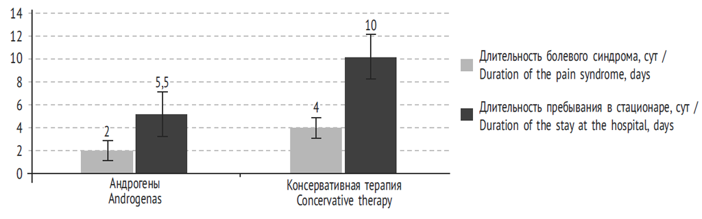 Заместительная терапия андрогенами как элемент комплексной терапии в раннем послеоперационном периоде у пациентов, перенесших хирургические вмешательства, способствует существенному уменьшению длительности лейкоцитурии, сокращению продолжительности антибактериальной терапии, снижению интенсивности и длительности боли, что приводит к минимизации длительности пребывания пациента в стационаре (рис. 3).