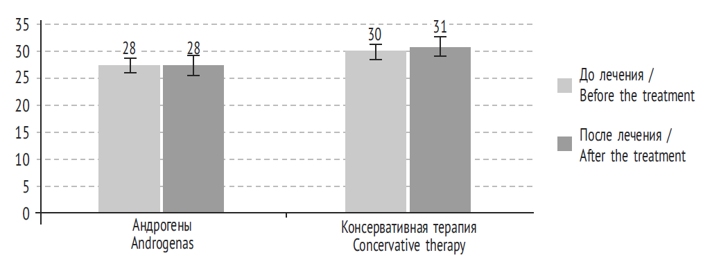 Ни у кого из пациентов на фоне заместительной терапии андрогенами никаких побочных эффектов и негативных реакций на введение препаратов отмечено не было. При оценке объема предстательной железы существенных различий в группах до и после лечения не выявлено (рис. 4).