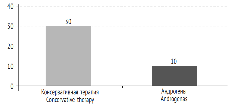 Если пациент был фертильного возраста и планировал детей, подкожно назначали гонадотропин по 3000 Ед два раза в неделю в течение трех месяцев с последующим двухмесячным перерывом и повторным курсом гонадотропина до нормализации концентрации тестостерона в крови. Если пациент был фертильного возраста и не планировал в данный момент детей, рекомендовали криоконсервирование спермы и назначали андрогель по 50 мг в день ежедневно в течение двух месяцев.