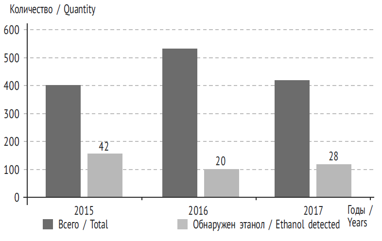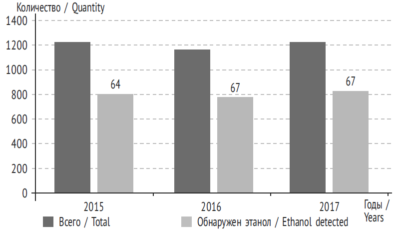 Проведенное нами исследование показало, что за 2015–2017 гг. не наблюдалось тенденции к снижению острых отравлений этанолом в структуре общей смертности (табл. 2). Нужно отметить, что количество острых отравлений наркотическими веществами (опиатами, каннабиоидами, кокаином и др.) практически в два раза превышает количество острых отравлений этанолом.