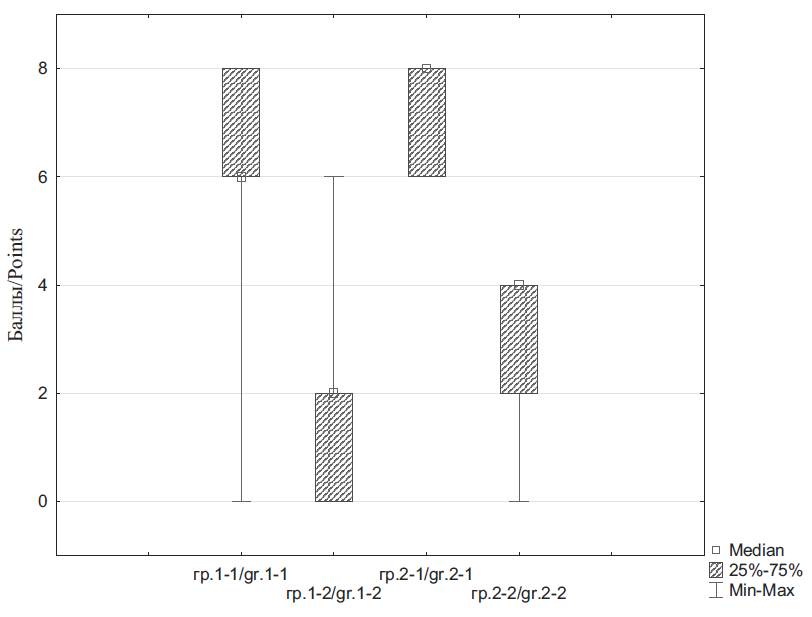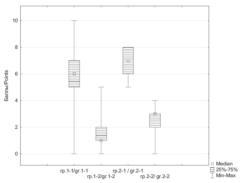 Рис. 2. Оценка боли в нижней части спины с помощью вербальной оценочной шкалы до и после лечения в обеих группах. гр. 1-1 — 1-я группа до лечения; гр. 1-2 — 1-я группа после лечения; гр. 2-1 — 2-я группа до лечения; гр. 2-2 — 2-я группа после лечения