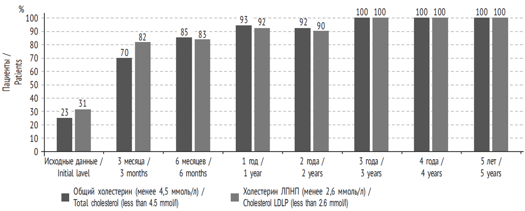 Рис. 2. Достижение целевых показателей общего холестерина и холестерина липопротеинов низкой плотности (ЛПНП) после билиопанкреатического шунтирования (% пациентов)