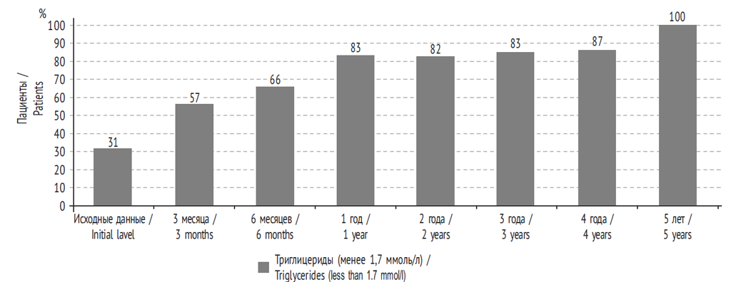 Рис. 3. Достижение целевых показателей общих триглицеридов после билиопанкреатического шунтирования (% пациентов)