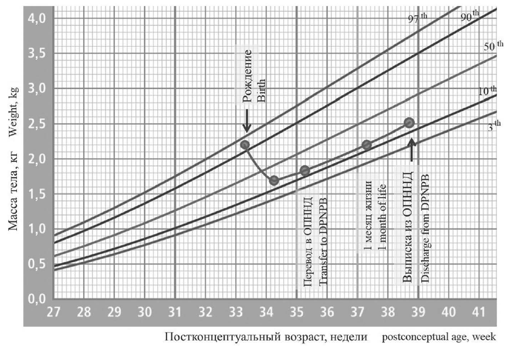 Масса тела на момент перевода в ОПННД составила 1829 г, продолжено лечение и наблюдение специалистов. По нашему мнению, снижение массы тела было обусловлено уменьшением количества серозной жидкости в тканях и внутренних органах ребенка (динамика массы тела за период лечения представлена на рис. 1). Состояние девочки постепенно улучшалось, ела из соски, сосание хорошее. Оценка физического развития в первый месяц жизни по шкале INTERGROWTH-21st соответствовала нормативным значениям: масса — 2240 г, длина — 46 см, окружность головы — 32,5 см, окружность груди — 29 см.