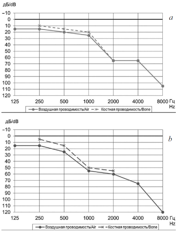 Fig. 1. Pure threshold audiometry: а – right ear, b – left ear