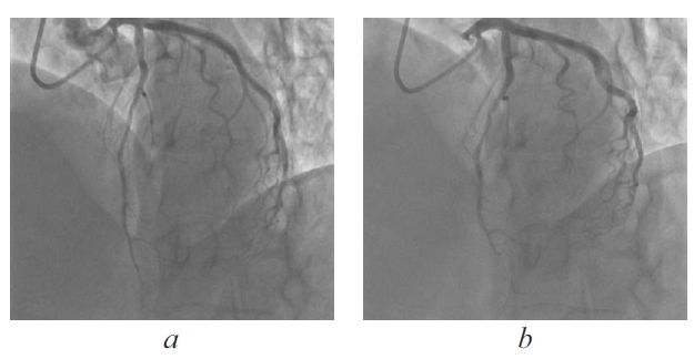 Рис. 1. Мышечный мостик передней нисходящей артерии (коронарная ангиография) в диастолу (a) и в систолу (b)