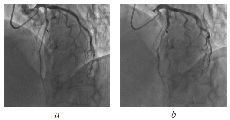 From March 18, 2014 to April 1, 2014, she was treated at a hospital in an emergency for suspected unstable angina. The patient underwent coronary angiography, which revealed a myocardial bridge of the left anterior descending artery with dynamic stenosis of up to 70%, and a small shunt from the pool of the left coronary artery into the left ventricle was revealed using contrast medium (Fig. 1 a, b). Coronary artery stenosis was not detected. On discharge, additional examinations, including Holter ECG monitoring and stress echocardiography, were recommended to the patient. Disaggregants (acetylsalicylic acid), calcium antagonists (amlodipine), diuretics (torasemide), ACE inhibitors, and beta-blockers were prescribed as components of a permanent medical treatment.