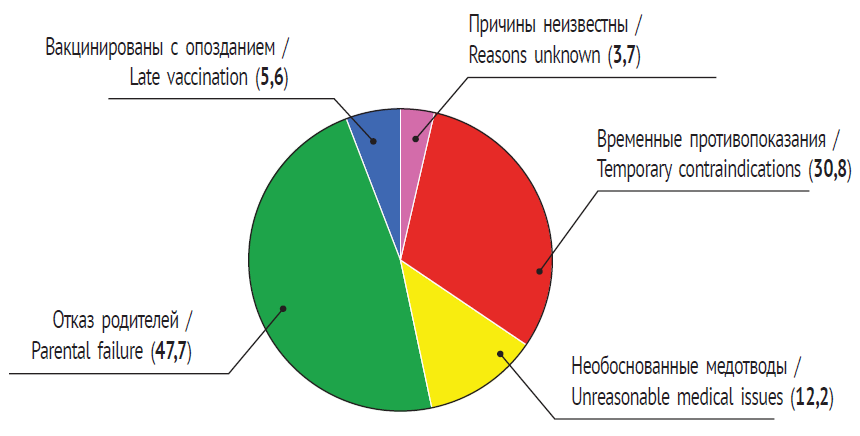 The high frequency of severe and complicated forms of infectious diseases in young children, with the possibility of death, confirms the importance of timely specific protection of this age group. In order to identify the causes of violation of the terms of vaccination of young children, 469 histories of children from 0 to 12 months of life were studied. The analysis showed that only 77% of the observed children in the first year of life were vaccinated according to the immunization schedule, whereas in 23% of cases, violations of the vaccination status were found. In 45% of children, the time of immunization was violated already at the stage of the maternity hospital: only every fifth child was not vaccinated because of health reasons, while 79% of children did not receive prophylactic vaccinations due to the mother’s refusal. Medical abductions prevailed in the structure of violations of vaccination terms in the сhildren’s оutpatient: 39% of children were vaccinated with deviations from the schedule due to temporary contraindications, 22% were vaccinated later than terms due to unreasonable medical leads. In 39% of cases of violation of vaccine status is associated with a misunderstanding of the parents of the risk of infectious diseases and the effectiveness of the child’s protection through immunization. Of these, 22% of children were denied, 10% of children were vaccinated with a significant delay, 7% of children did not reach the сhildren’s оutpatient during the year without an explanation of the reasons. Thus, the analysis showed that the majority of the observed children (57%) did not receive timely protection against infectious diseases due to attitudes towards vaccinations of parents, 43% of children were not vaccinated due to medical abductions.
