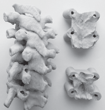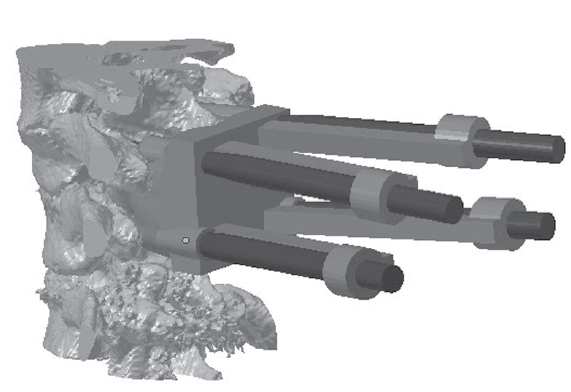 Рабочей поверхности опорной площадки с использованием алгоритма проецирования придавали форму отпечатка задних структур соответствующих позвонков. Тубусы-направители позиционировали соответственно моделям шила. Объединением опорной площадки и тубусов-направителей получали навигационный шаблон (рис. 1). В случае если число смежных фиксируемых сегментов превышало три, создавали два или более навигационных шаблона. Модель зоны интереса и навигационный шаблон распечатывали на 3D-принтере из полилактида (polylactide, PLA) (рис. 2).