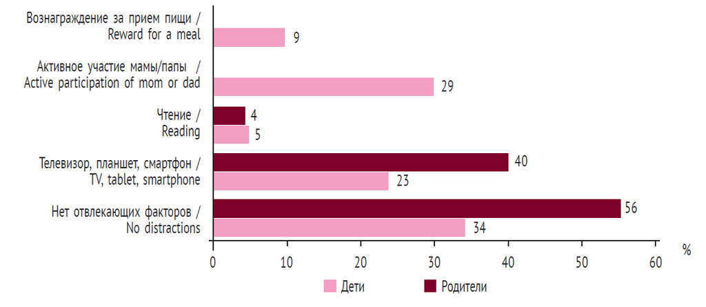 На рис. 1 представлена частота внешних факторов, которые могли отвлекать от приема пищи ребенка и родителей. Отвлекающие от приема пищи факторы отсутствовали у 56 % родителей и у 34 % детей, телевизор или мобильные гаджеты во время приема пищи были необходимы 40 % взрослых и 23 % детей. В активном участии и помощи родителей в приеме пищи нуждались 29 % детей, а в дальнейшем в вознаграждении за прием пищи — 9 %. Потребность в чтении книги во время приема пищи отмечена у 4 % родителей и 5 % детей соответственно.