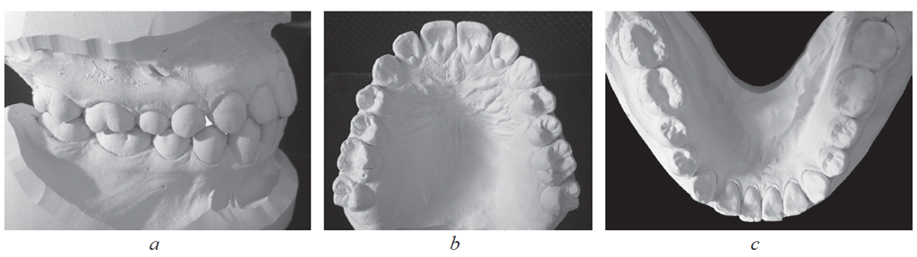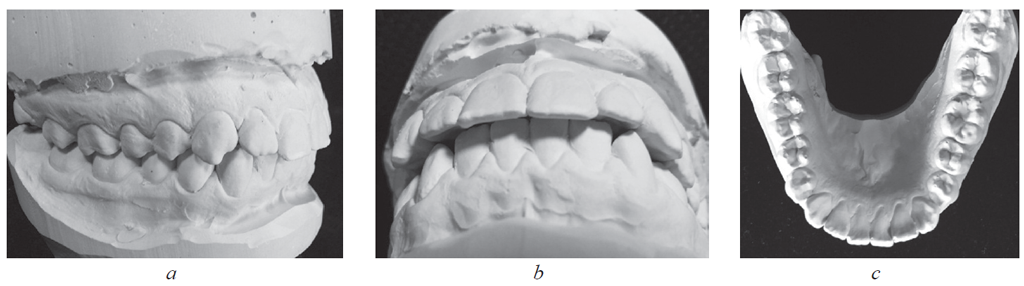 Рис. 1. Физиологическая протрузия резцов на гипсовых моделях челюстей: a — обе челюсти; b — верхняя челюсть; c — нижняя челюсть