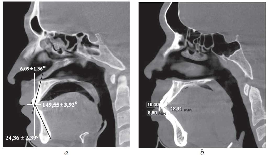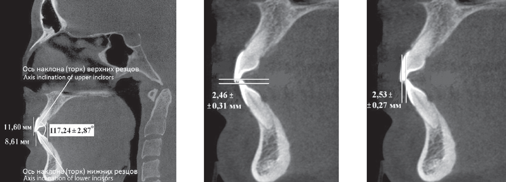 Результаты. У пациентов 1-й группы с протрузией резцов межрезцовый угол составил 149,55 ± 3,92°, торк верхних резцов — 24,36 ± 2,39°. При ретрузии резцов величина межрезцового угла составила 151,47 ± 2,94°, торк верхних резцов — 5,85 ± 1,42°. При этом величина вертикального перекрытия соответствовала величине сагиттального перекрытия и не превышала 2–3 мм. У пациентов 2-й группы, как правило, отмечалось нарушение формы зубных дуг в переднем отделе.