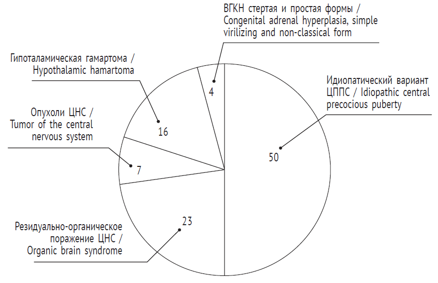 In 50% of cases, an idiopathic variant of CPP is registered. Pediatric patients with residual organic lesions of the central nervous system (CNS) make up 23% of patients. CNS tumors (gliomas and astrocytomas of the chiasmosellar region and the floor of the ventricle III) account for 7% of all CPP cases. Of cases, 16% has hypothalamic hamartoma, which is represented by ectopia of hypothalamic tissue caused by the migration of neurons in the embryonic period and secretion of GnRH. Patients who have developed CPP syndrome during simple virilizing and nonclassical forms of congenital adrenal cortical hyperplasia make up 4%.