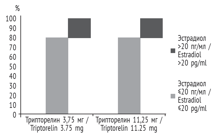 Рис. 2. Количество пациенток (%), у которых уровни базального эстрадиола не превышали 20 пг/мл при лечении Трипторелином 3,75 мг и 11,25 мг