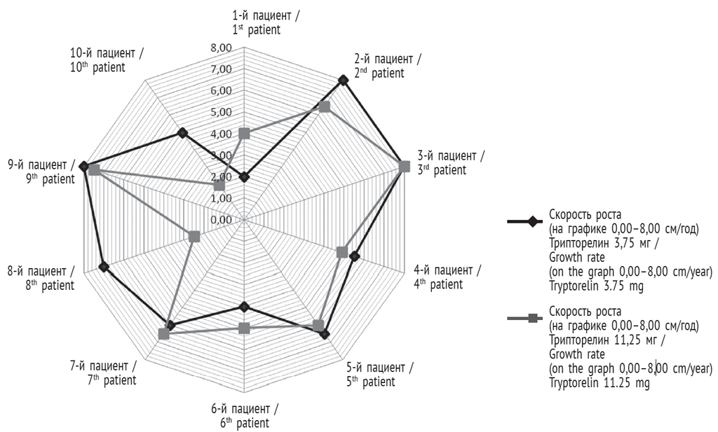Growth rates before treatment with drugs of the GnRH antagonist group and during therapy with triptorelin 11.25 mg are illustrative (11.2 ± 3.6 and 5.75 ± 1.5 cm/year, respectively), which meets the efficiency criterion for reducing the growth rate to the age norm.