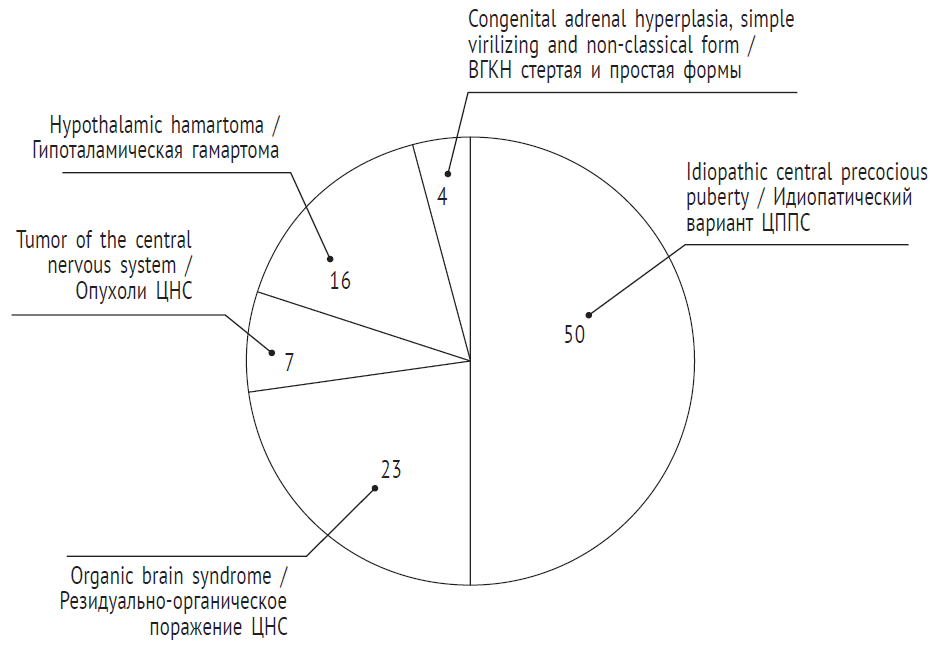 In 50% of cases, an idiopathic variant of CPP is registered. Pediatric patients with residual organic lesions of the central nervous system (CNS) make up 23% of patients. CNS tumors (gliomas and astrocytomas of the chiasmosellar region and the floor of the ventricle III) account for 7% of all CPP cases. Of cases, 16% has hypothalamic hamartoma, which is represented by ectopia of hypothalamic tissue caused by the migration of neurons in the embryonic period and secretion of GnRH. Patients who have developed CPP syndrome during simple virilizing and nonclassical forms of congenital adrenal cortical hyperplasia make up 4%.