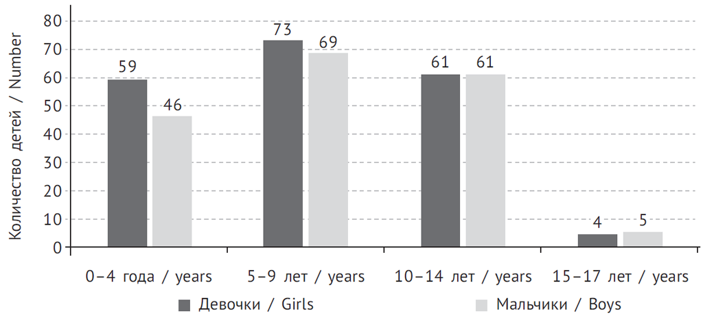 С каждым годом констатируется увеличение числа детей с вновь выявленным диабетом во всех возрастных группах и тенденция к «омоложению» диабета: снижение заболеваемости среди детей более старшего возраста и увеличение доли детей 0–4 и 5–9 лет. Среди обследованных 105 человек (27,8 %) — это дети 0–4 лет, 142 человека (37,6 %) в возрасте 5–9 лет, 122 человека (32,3 %) — 10–14 лет и 9 человек (2,4 %) — 15–17 лет.