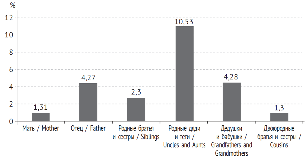 Четверть пациентов (98 человек) имели родственников с СД1. В 31 случае (7,9 %) это были родственники первой линии родства: диабетом болели 5 матерей (1,3 %), 13 отцов (3,4 %), 13 родных братьев и сестер (3,4 %). У 60 детей (15,9 %) СД1 болели родные дяди и тети — 10,6 %, бабушки и дедушки — 4,0 %; двоюродные братья и сестры — 1,3 %. Еще у 21 ребенка (5,6 %) были выявлены дальние родственники с СД1 (рис. 2). 14 пациентов (3,7 %) имели двух и более родственников с СД1.