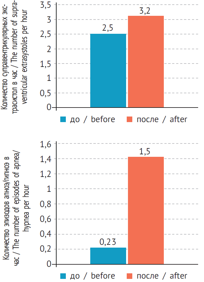 Рис. 2. Количество суправентрикулярных экстрасистол и эпизодов апноэ/гипноэ у женщин до и после индукции суперовуляции (р < 0,05)