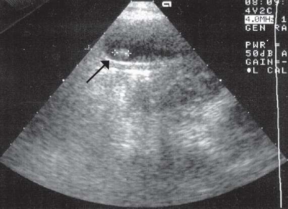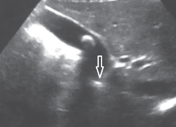 Возраст пациентов был от 2 до 17 лет. В 70,4 % случаев заболевание отмечено у девочек, соответственно у мальчиков — 29,6 %. У 7,8 % пациентов заболевание возникло на фоне гемолитической анемии. Около трети пациентов предъявляли жалобы на умеренно выраженный болевой синдром или чувство тяжести в верхней половине живота. У 15 % детей клинические симптомы возникали на фоне погрешностей в диете. При этом клинические и биохимические показатели анализов крови и мочи, в том числе печеночного профиля, были в пределах нормы. Вышеуказанные симптомы послужили показанием к проведению ультразвукового исследования (УЗИ). У пациентов с бессимптомным течением ЖКБ УЗИ было назначено по другому поводу. При проведении УЗИ у всех пациентов в желчном пузыре обнаруживали гиперэхогенные образования (рис. 1), смещаемые при изменении положения тела (конкременты).