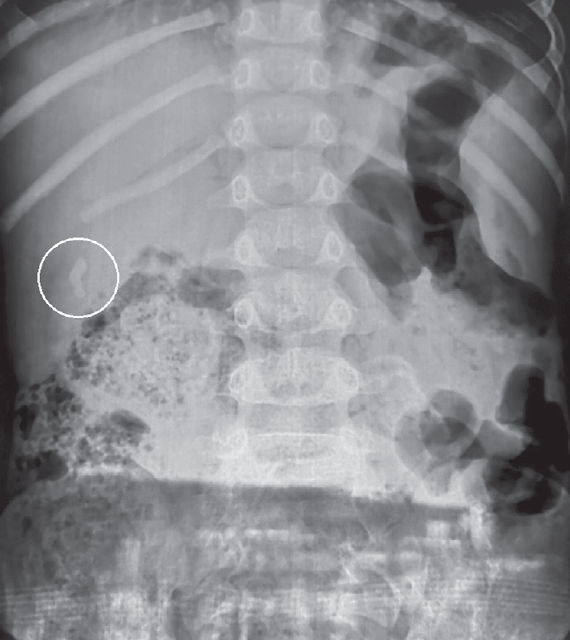 После установления диагноза ЖКБ всем пациентам проводилась обзорная рентгенография брюшной полости с целью обнаружения кальцинированных конкрементов в желчном пузыре. У двух пациентов они были четко визуализированы, вследствие чего детям консервативное лечение не проводилось и были установлены показания к оперативному лечению (рис. 3).