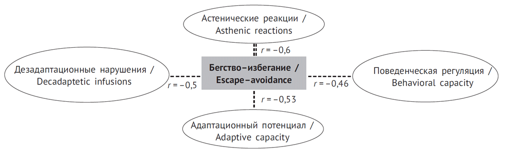 Корреляционный анализ защитно-совладающего поведения женщин с АтД выявил сильную отрицательную взаимосвязь преобладающей стратегии совладания «бегство–избегание» с проявлением астенических реакций и состояний (r = –0,6; p < 0,01); отрицательные связи с адаптационным потенциалом (r = –0,53; p < 0,05), поведенческой регуляцией (r = –0,46; p < 0,05), дезадаптационными нарушениями (r = –0,5; p < 0,05) (рис. 1).