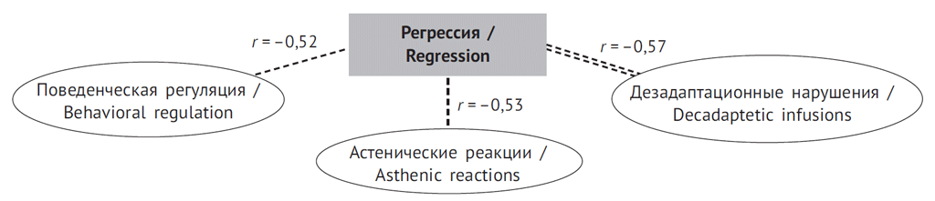 Ядро второй корреляционной плеяды (рис. 2) составляет еще один механизм психологической защиты «регрессия», имеющий сильную отрицательную взаимосвязь с дезадаптационными нарушениями (r = –0,57; p < 0,01), отрицательную взаимосвязь с поведенческой регуляцией (r = –0,53; p < 0,05) и проявлением астенических реакций и состояний (r = –0,53; p < 0,05).