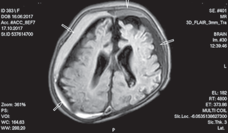 Пациентка 1 (новорожденная девочка), от третьих преждевременных оперативных родов на 33/34 неделе (отслойка плаценты), оценка по шкале Апгар 6/7 баллов, поступила на отделение реанимации и интенсивной терапии Перинатального центра СПбГПМУ на первый день жизни. У ребенка диагностирован врожденный порок развития — левосторонняя диафрагмальная грыжа, гипоплазия левого легкого, сопровождающиеся тяжелыми гемодинамическими нарушениями. Находилась на длительной инвазивной вентиляции легких. Приступы полифокальных клонических судорог выявлены на вторые сутки жизни. Пароксизмы купированы внутривенным введением Реланиума. Повторные эпизоды судорог (полиморфные, с преобладанием полифокальных миоклонических/клонических приступов) отмечены с 7-го дня жизни, назначена терапия Фенобарбиталом (стартовая доза 20 мг/кг в сутки), с четырехкратным суточным введением внутривенно Реланиума 0,5 % 0,2 мг/кг на один прием. В связи с продолжением и учащением приступов с 28-го дня жизни противосудорожная терапия усилена леветирацетамом/Кеппра (сироп по 20 мг/кг в сутки), на фоне приема которого приступы судорог стали менее продолжительными, но полиморфность приступов сохранялась. В неврологическом статусе отмечались церебральная депрессия с нарушением сознания (сомнолентность), диффузная мышечная гипотония, симметричное снижение глубоких рефлексов, отсутствие сосательного рефлекса. К концу первого месяца жизни появилась деформация костей по сагиттальному и лямбдовидному швам, отсутствовал прирост окружности головы (формировалась вторичная микроцефалия). Выполнен нейровизуализационный мониторинг. При проведении краниальной сонографии в неонатальном периоде выявлено патологическое увеличение субарахноидального пространства. К концу третьего месяца наблюдалось увеличение краниоцеребральной диспропорции (расширение подоболочечных пространств до 20 мм над лобными и теменными долями больших полушарий), расширение большой цистерны мозга. Учитывая выявление сонографических признаков расширения подоболочечных пространств, выполнена МРТ головного мозга в возрасте 3 месяцев 1 недели. На МРТ головного мозга были визуализированы двухсторонние субдуральные хронические гематомы с кровоизлияниями различной давности. Определялись атрофическое изменение белого и серого вещества обеих гемисфер, смешанная заместительная гидроцефалия. Данные представлены на рис. 1. После диагностирования субдуральных гематом было принято решение о проведении пациентке нейрохирургического вмешательства — выполнено наружное двухстороннее субдуральное дренирование под стереотаксической ультрасонографической навигацией. В послеоперационный период частота приступов и длительность уменьшились. Состояние оставалось крайне тяжелым, вспомогательная респираторная поддержка продолжалась. Отмечалось «малое сознание»: отсутствовала реакция на осмотр, ребенок открывал глаза спонтанно, без связи с раздражителем. Зрительной фиксации не получено. Черепная иннервация — зрачки нормотоничные, фотореакции сохранены, содружественного движения глазных яблок нет. Лицо симметричное. Язык по средней линии. Кашлевой рефлекс сохранен. Целенаправленной активности не выявлено. Обращали на себя внимание деформация костей мозговой части черепа, микроцефалия, частые ст